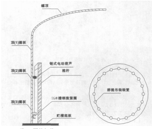 在壁板內(nèi)側(cè)一周均布20根桅桿,并安裝上鏈式電動葫蘆如圖所示:桅桿頂應(yīng)設(shè)有系桿,桅桿之間應(yīng)設(shè)10組剪刀叉支撐均布,以保證群桅裝置的穩(wěn)定性。