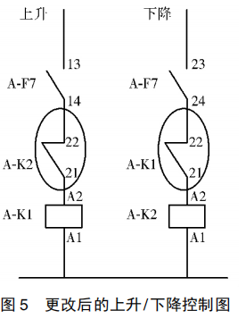 建議: 由于橋機電動葫蘆一般在檢修期使用較多,平時多為停機狀態(tài),其廠房內(nèi)震動較大,所以要注意日常維護,檢查元器件是否動作良好,有無銹蝕、接線松動等現(xiàn)象,并及時處理。更改其上升/下降控制圖,如圖 5。