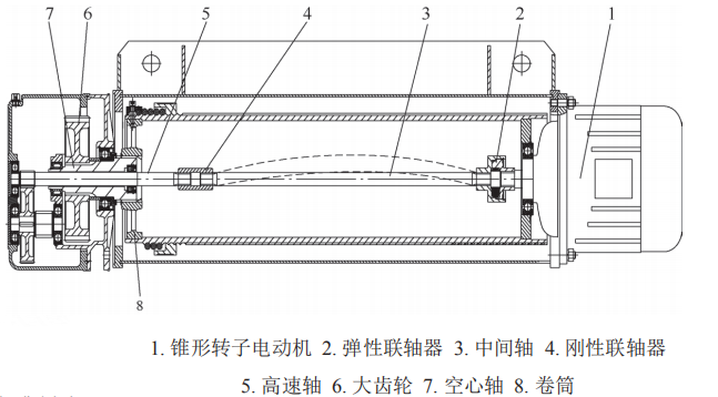 起升機構(gòu)動作原理:錐型制動電動機軸通過爪型彈性聯(lián)軸器與中間軸連接,再和剛性聯(lián)軸器與高速軸相連。當(dāng)電動機通電旋轉(zhuǎn)驅(qū)動減速器高速軸轉(zhuǎn)動時,并將力矩通過齒輪傳遞減速器最后一級大齒輪,大齒輪再通過空心軸相連,空心軸又通過花鍵與卷筒相連,通過減速傳動的力矩使卷筒旋轉(zhuǎn),使鋼絲繩纏繞或脫開卷筒而使吊鉤組和吊載物起升或下降,來完成起升機構(gòu)的功能。