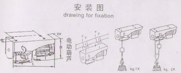 固定微型電動葫蘆需要使用六角頭螺栓、平墊圈、彈簧墊圈等附件。要確保各位件正確安裝,并用力矩扳手將螺栓緊固,“安裝圖”。要確保固定環(huán)(或其它代替件)緊緊壓住安裝桿(圓桿或方桿),使微型電動葫蘆機(jī)身不能沿安裝桿移動或轉(zhuǎn)動。