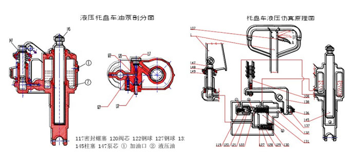 搬運(yùn)車的起升過(guò)程:將捏手107置于A位置,此時(shí)卸荷撞針132沒(méi)有抵觸鋼球122,此時(shí)搖動(dòng)手柄1,泵芯147在手柄1和彈簧149的共同作用下將作往復(fù)運(yùn)動(dòng)。當(dāng)泵芯147向上提升時(shí),柱塞泵a腔內(nèi)形成負(fù)壓,閥芯120和閥體121在彈簧119的作用下處于罐壁裝填,而鋼球122由于油壓作用自動(dòng)打開,油壓油從貯油室F腔流經(jīng)e腔,再經(jīng)鋼球122進(jìn)入柱塞泵a腔內(nèi),柱塞泵吸油過(guò)程完成。