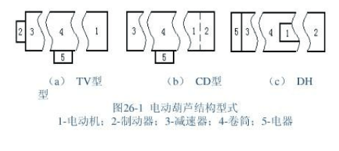 電動葫蘆的種類:電動葫蘆根據(jù)電動機(jī)、卷筒、制動器等主要部件位置的不同分為TV型、CD型和DH型,其部件相對位置如下圖: