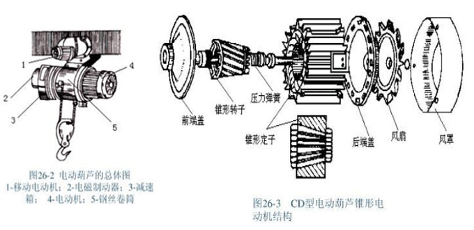 電動葫蘆的基本結(jié)構(gòu):電動葫蘆外形如下圖26-2所示。它由提升機(jī)構(gòu)和移動裝置兩部分組成,CD型提升機(jī)構(gòu)用錐形電動機(jī)拖動,移動裝置用普通籠形電動機(jī)拖動。錐形電動機(jī)與普通電動機(jī)的結(jié)構(gòu)不同,CD型電動葫蘆的錐形電動機(jī)的結(jié)構(gòu)如圖26-3所示。