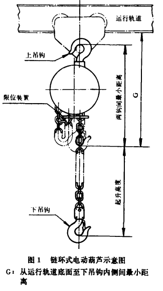 如圖1所示,起升額定載荷至限位裝置動(dòng)作并處于停止?fàn)顟B(tài)時(shí),測(cè)定上下吊鉤內(nèi)側(cè)間的距離。限位張志安裝在機(jī)體內(nèi)部的環(huán)鏈?zhǔn)诫妱?dòng)葫蘆為下吊鉤起升到上極限位置的狀態(tài)。帶有運(yùn)行小車的環(huán)鏈?zhǔn)诫妱?dòng)葫蘆,測(cè)定運(yùn)行工字梁軌道下翼緣底面至下吊鉤內(nèi)側(cè)間的距離。