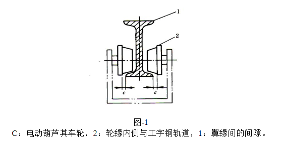 2、將主動輪、從動輪架在地面組裝,實測主梁翼板寬度。組裝時保證電動葫蘆車輪輪緣內(nèi)側(cè)與工字鋼軌道梁翼緣的間隙控制在3-5mm。預(yù)組裝后復(fù)測符合要求,進行組裝。如圖1.