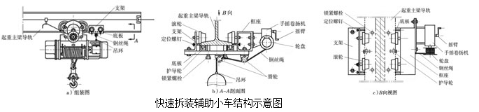 為克服現(xiàn)有技術(shù)的上述缺陷,研發(fā)了一種電動(dòng)葫蘆起重機(jī)快速拆裝輔助小車。該裝置利用滾輪與手搖卷揚(yáng)機(jī),提供一種省力、省時(shí)、拆裝安全方便的方式。