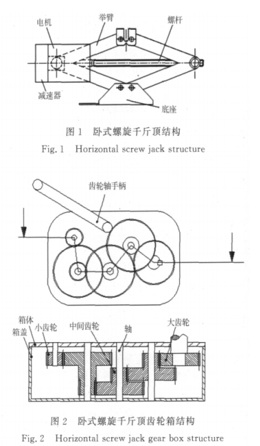 新型臥式螺旋千斤頂系統(tǒng)由電機、減速箱、上下舉臂、固定板和底座組成,且可實現(xiàn)電動與手動的快速轉(zhuǎn)換。電動時,電機可正反轉(zhuǎn)動,通過1組外嚙合圓柱齒輪減速后帶動螺桿轉(zhuǎn)動,可實現(xiàn)千斤頂?shù)捻斊?、回落過程。手動時,可通過在齒輪箱定位孔上安裝手柄,通過首要手柄架,帶動螺桿轉(zhuǎn)動,電動與手動的快速轉(zhuǎn)換通過齒輪軸手柄裝入和取出實現(xiàn),結(jié)構(gòu)簡單,切換可靠。