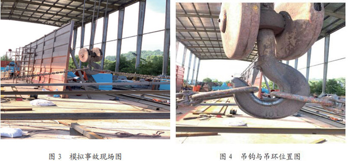 為還原事故真想,將吊鉤防脫鉤裝置恢復(fù)到正常工作位置,在采取相應(yīng)安全措施的前提下,現(xiàn)場模擬事發(fā)時的工作狀態(tài),如圖3所示,重新用2副雙肢環(huán)鏈索具懸掛被吊物,在索具張緊后緩慢提升被吊物,待被吊物一端離地后停止,進行 現(xiàn)場觀察確認。由現(xiàn)場模擬狀態(tài)可知: