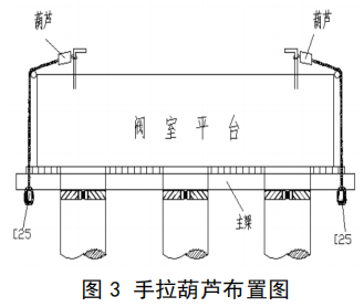拆除底模支撐系統(tǒng)時(shí),首先在閥室平臺(tái)上部的兩端各安置1個(gè)手拉葫蘆,手拉葫蘆的頂端掛在預(yù)埋的 Φ25mm 的鋼筋上,底部各吊 1 根 [25 的槽鋼,槽鋼垂直于主梁 I36a工字鋼,將兩根主梁支撐起;然后慢慢地逐個(gè)松動(dòng)抱箍的高強(qiáng)螺栓,使抱箍下降一定的高度,為拆除工字鋼和木方留出空間,再將高強(qiáng)螺栓緊固至一定的程度,保證抱箍至少能承受工字鋼和木方的自重;最后將底模、木方、槽鋼和工字鋼依次取出。手拉葫蘆布置如圖 3 所示。