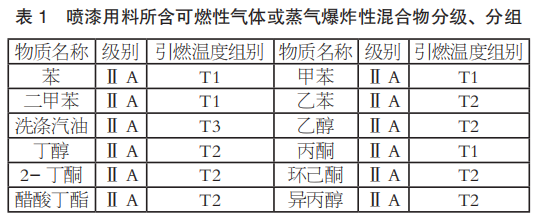 爆炸性氣體環(huán)境電力裝置設(shè)計前要有爆炸危險區(qū)域劃分圖,對于簡單或小型廠房,可采用文字說明表達(dá)。《涂裝作業(yè)安全規(guī)程 涂漆工藝安全及其通風(fēng)凈化》(GB 6514-2008)明確了封閉或半封閉涂漆工藝裝備內(nèi)部為 1 區(qū)爆炸性危險區(qū)域,其開敞面以外,水平距離 3m,垂直距離 1m 以內(nèi)的空間區(qū)域劃為 2 區(qū)爆炸性危險區(qū)域。按照《爆炸危險環(huán)境電力裝置設(shè)計規(guī)范》(GB 50058-2014)的強(qiáng)制性條文,選擇隔爆型(“d”)結(jié)構(gòu)符合 1 區(qū)爆炸性危險區(qū)域的要求,防爆電動葫蘆采用了隔爆電動機(jī)、隔爆電氣控制柜和隔爆按鈕。噴漆用料所含可燃性氣體或蒸氣爆炸性混合物分級、分組見表1。