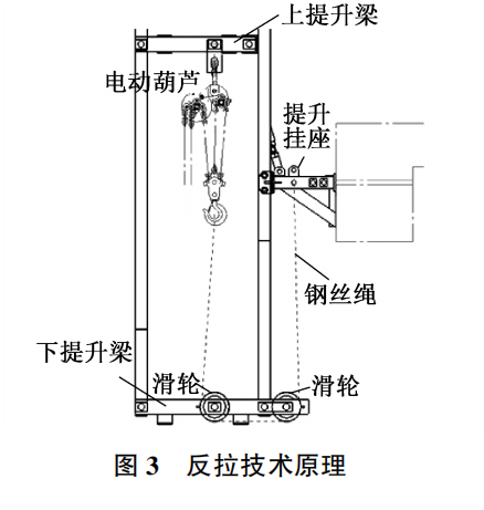 將電動(dòng)葫蘆固定在架體上,隨架體升降,避免每次提升需倒換電動(dòng)葫蘆。同時(shí),針對傾覆力難以控制的問題,智能附著式升降腳手架采用滑輪換向,即采用鋼絲繩一端固定在電動(dòng)葫蘆下掛鉤,另一端固定在附墻掛座上,中間通過滑輪換向,滑輪與提升梁上固定點(diǎn)呈豎直狀態(tài)?避免角度變化,保證了傾覆力矩為恒定值,且受力明確,架體升降時(shí)只需倒換鋼絲繩即可大大降低了倒換難度如圖3所示。電動(dòng)葫蘆反拉技術(shù)的特點(diǎn)如下: