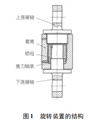 鋼絲繩旋轉(zhuǎn)裝置的結(jié)構(gòu)見圖1,上連接軸1與套筒2通過(guò)螺紋連接,并用銷釘鎖死形成一體,與此類似下連接軸5穿入套筒內(nèi)后,與套筒內(nèi)的鎖母3旋合并鎖死,這樣整個(gè)裝置就分為上下兩部分。這兩部份通過(guò)中間的推力軸承4連接起來(lái)。該裝置最大的特點(diǎn)在于,由于有推力軸承存在,上下兩部份可以獨(dú)立地轉(zhuǎn)動(dòng),即在上連接軸發(fā)生旋轉(zhuǎn)時(shí),下連接軸保持不動(dòng),這正滿足了解決鋼絲繩“打麻花”問(wèn)題的要求。