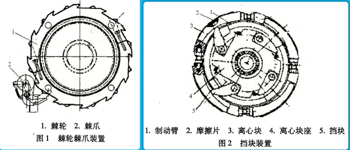 該類安全制動裝置也是裝于減速器低速級傳動末端卷筒的一端部,是一制動摩擦帶和附裝有離心塊擋塊裝置。制動摩擦帶纏于卷筒上,4塊棘輪通過高強(qiáng)螺釘壓緊制動摩擦帶,4個離心塊和擋塊均布固定在離心塊座上,位于卷筒內(nèi)。正常情況下離心塊和制動摩擦帶隨卷筒一同轉(zhuǎn)動,當(dāng)工作制動器失靈或傳動部件破斷,載荷快速下降使離心塊在離心力作用下打開,擋塊快速卡住離心塊使卷筒停住。因此,下落的重物被支持住實(shí)現(xiàn)制動。