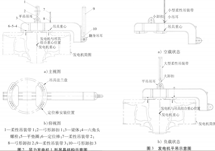 風(fēng)力發(fā)電L形平吊與翻轉(zhuǎn)吊具主要有柔性吊裝帶1、弓形卸扣1、梁體、六角頭螺栓、六角頭螺栓、平墊圈、定位棒、柔性吊裝帶2、弓形卸扣2、柔性吊裝帶3、弓形卸扣3等零部件組成。此吊具具有平吊和翻轉(zhuǎn)兩種吊裝功能,發(fā)電機(jī)裝車、卸車時(shí)可用此吊具進(jìn)行平吊吊運(yùn),上實(shí)驗(yàn)臺(tái)做試驗(yàn)時(shí)可用此吊具進(jìn)行翻轉(zhuǎn),結(jié)構(gòu)簡單,操作方便,翻身快捷。