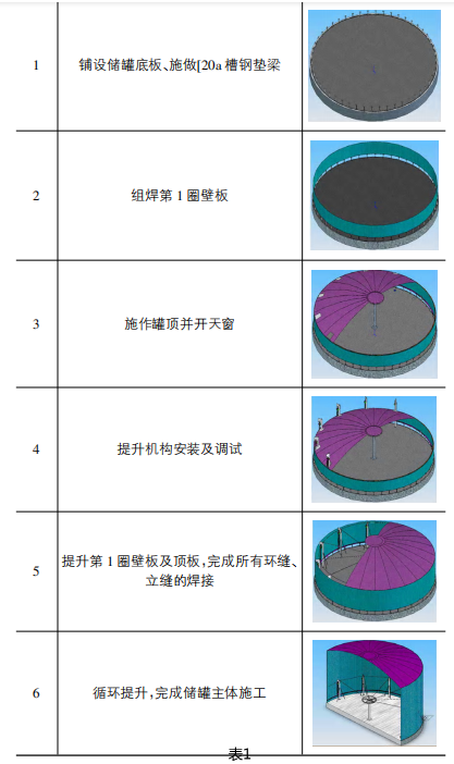 該工法主要施工順序:鋪設(shè)儲(chǔ)罐底板→組焊第1圈壁板→施做罐頂→灌頂開天窗(便于提升立柱傳出)→提升機(jī)構(gòu)安裝及調(diào)試、組焊第2圈壁板(預(yù)留外側(cè)立縫1條不焊)→提升第2圈壁板及頂板至預(yù)定高度的一半,檢查及調(diào)整提升效果→繼續(xù)提升至預(yù)定高度→調(diào)整環(huán)縫間隙及錯(cuò)邊,收緊第2圈壁板合口→完成所有環(huán)縫、立縫的焊接→提升機(jī)構(gòu)下落→重復(fù)上述提升,完成底端壁板。施工流程及順序件表1所示。