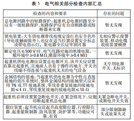 按照企業(yè)特種設(shè)備檢查要求,對(duì)筒倉(cāng)頂、焦?fàn)t兩 端、篩焦樓、各風(fēng)機(jī)房及廠房?jī)?nèi)電動(dòng)葫蘆設(shè)備進(jìn)行了 檢查,對(duì)所發(fā)現(xiàn)的問(wèn)題進(jìn)行統(tǒng)計(jì)和歸納,具體如表 1 所示,其他符合要求的項(xiàng)目未一一列出。