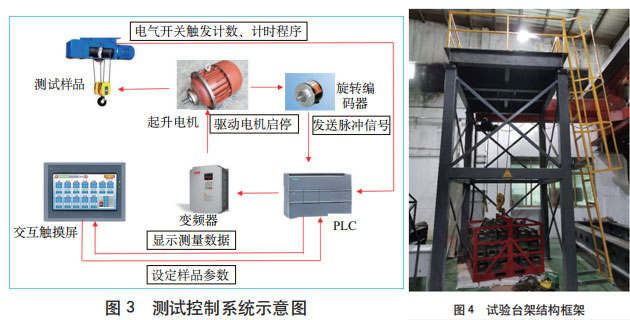 3)觸發(fā)、制停距離檢測(cè)。采用旋轉(zhuǎn)編碼器可實(shí)現(xiàn)觸發(fā)距離與制停距離的測(cè)量。動(dòng)態(tài)負(fù)載試驗(yàn)下,觸發(fā)、制停距離過(guò)大,或者無(wú)法實(shí)現(xiàn)制動(dòng)功能,表明棘輪棘爪型安全制動(dòng)器可靠性無(wú)法滿(mǎn)足要求。測(cè)試裝置主要由鋼結(jié)構(gòu)試驗(yàn)臺(tái)架、測(cè)試控制系統(tǒng)、輔助吊運(yùn)裝置、梯子平臺(tái)等構(gòu)成,見(jiàn)圖4。該測(cè)試裝置功能包括:1)對(duì)5t及以下單軌小車(chē)式及雙梁小車(chē)式鋼絲繩電動(dòng)葫蘆進(jìn)行靜態(tài)和動(dòng)態(tài)試驗(yàn)(不含小車(chē)行走功能);2)測(cè)量、顯示并記錄空載變頻調(diào)速下電動(dòng)葫蘆棘輪制動(dòng)器的觸發(fā)速度;3)測(cè)量、顯示并記錄負(fù)載墜落試驗(yàn)下電動(dòng)葫蘆棘輪制動(dòng)器的觸發(fā)速度、觸發(fā)制停時(shí)間、觸發(fā)后的制動(dòng)下滑量。