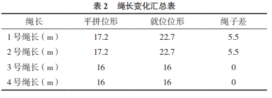 (2)就位狀態(tài)繩長計算:使用設(shè)計軟件TEKLA,對就位位形狀態(tài)進行模擬,通過重心不變原理,做重心垂線,使所有繩子交于一點,測量出每個繩子的長度。如表2所示,整個位形轉(zhuǎn)換過程中,1號和2號繩長是不變的,3號和4號可調(diào)繩長需要伸長5.5m,所以5.5m就是手拉葫蘆需要調(diào)節(jié)的長度。