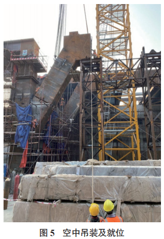 (4)起扳和就位:起板過程需要具有上崗證書的起重工通過對講機進行良好的溝通,注意查看吊鉤的重心和節(jié)點的重心是否在一條線上,避免起吊過程中出現(xiàn)大的晃動。起重工調(diào)整手拉葫蘆(伸長手拉葫蘆),使斜柱底段逐漸下落,調(diào)整至就位位形的繩長時,采用全站儀測量斜柱頂部,保證水平誤差在±10mm 以內(nèi);然后緩慢吊裝就位,就位以后微調(diào)手拉葫蘆,保證對接縫順利連接,頂部處于水平狀態(tài),誤差在±3mm 以內(nèi),然后停止調(diào)整,對斜柱進行焊接加固?,F(xiàn)場實施如圖5所示。