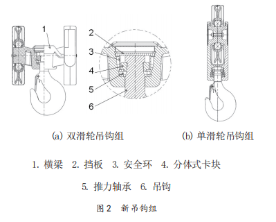 新設(shè)計(jì)的吊鉤組在總體結(jié)構(gòu)、外形、材料、機(jī)加工及使用功能等多個方面進(jìn)行了優(yōu)化。總體結(jié)構(gòu)詳見圖 2。對于雙滑輪吊鉤組,采用特殊設(shè)計(jì)的橫梁,將傳統(tǒng)的滑輪軸及吊鉤橫梁功能合二為一,減少了零部件數(shù)量,簡化了裝配工藝。另外該設(shè)計(jì)可以使用標(biāo)準(zhǔn)吊鉤并實(shí)現(xiàn)最小的整體高度尺寸。使用分體式卡塊替代螺紋連接,省去了吊鉤螺母,改善應(yīng)力集中,避免配做簡化裝配。設(shè)置鋼絲繩保護(hù)裝置并且在設(shè)計(jì)中盡可能的降低吊鉤組重心,即保護(hù)了鋼絲繩又能最大程度的避免空鉤偏斜的問題。對于單滑輪吊鉤組,將滑輪軸、拉板及吊鉤橫梁整合為一個零件,并且采用分體式結(jié)構(gòu),進(jìn)一步簡化了零件數(shù)量和裝配流程??▔K及吊鉤組為系列化設(shè)計(jì),盡量通用,減少了整個系列的零部件數(shù)量。