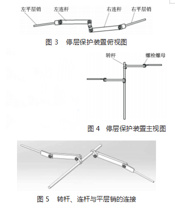 經(jīng)分析,升降機(jī)所用停層保護(hù)裝置為轎廂左、右兩 側(cè)的平層銷。該平層銷采用一套連桿裝置,通過(guò)轉(zhuǎn)桿的 轉(zhuǎn)動(dòng)帶動(dòng)左、右兩側(cè)的連桿,再由連桿帶動(dòng)兩側(cè)的平層銷伸出或收回(圖 3、圖 4)。