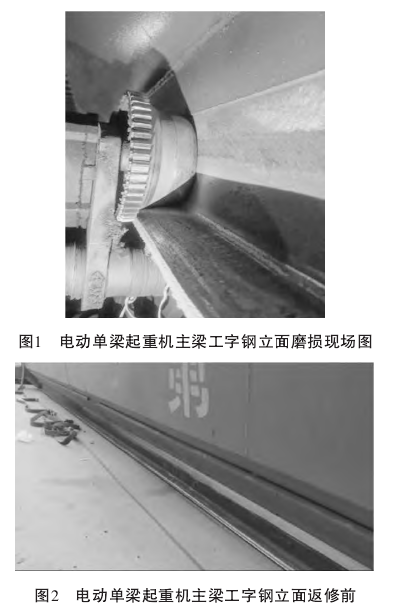 下面是檢驗過程中發(fā)現(xiàn)的電動單梁起重機主梁工字鋼立面磨損圖片(見圖1),以及吊至地面準備返修前的圖片(見圖2)。主梁工字鋼磨損常見表現(xiàn)形式為立面磨損出金屬光澤。