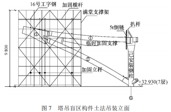 2、超重構(gòu)件土法吊裝:1 號塔吊 C6015 起重能力較小,而 CC 軸部分構(gòu)件超重,因此需進行土法吊裝。其中,對于超重鋼柱,首先在其兩側(cè)搭設(shè)格構(gòu)式胎架并在胎帽頂部設(shè)置 16 號工字鋼( 工字鋼與胎帽焊接牢固) 組成門字架,然后在工字鋼中部掛設(shè) 5 t 倒鏈進行吊裝; 對于超重鋼屋蓋主梁,采用在主梁兩端已安裝的鋼柱牛腿上分別設(shè)置扒桿,然后在扒桿上掛設(shè) 5 t 倒鏈進行抬吊。格構(gòu)式胎架采用 1 號塔吊 C6015 進行安拆及周轉(zhuǎn)。