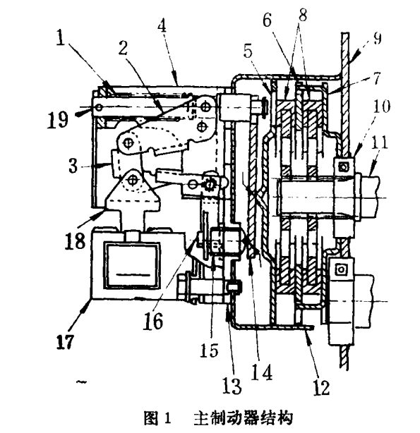 備注:1為壓力彈簧,2、3為連桿A、B,4為彈簧壓板,5/6/7為制動盤A/B/C,8為制動輪,9為機架,10為軸承,11為一級軸齒輪,12,13為制動電磁鐵支架A、B,14為制動器杠桿,15為調整螺釘,16為調整杠桿,17為固定鐵心,18為可動鐵心,19為制動桿。