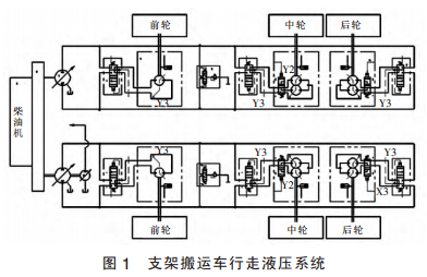 支架搬運車普遍采用液壓傳動的驅(qū)動方式,由于其載重量大,作業(yè)效率高、安全性高等特點,支架搬運車在井下搬家作業(yè)中使用越來越廣泛。其液壓系統(tǒng)主要由閉式行走系統(tǒng)、轉(zhuǎn)向系統(tǒng)、控制系統(tǒng)、制動系統(tǒng)、輔助系統(tǒng)和管路系統(tǒng)等部分組成。