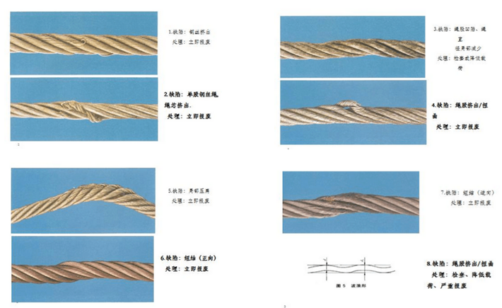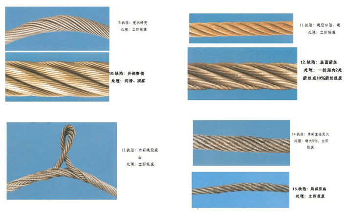 上面的圖片可以清楚的看出哪些鋼絲繩是需要報廢的,哪些是需要減少起重量來進行起吊的。鋼絲繩在上述所述立即報廢的情況下,需要立即報廢。否則會產(chǎn)生一些致命的危險。