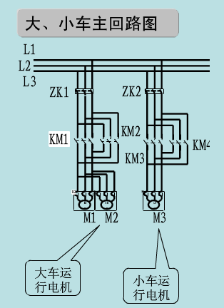大小車運(yùn)行電機(jī):其均靠接觸器進(jìn)行控制正反向,接觸器均有互鎖,其中大車運(yùn)行電機(jī)各帶前后兩個(gè)行走輪,一般為單電機(jī)驅(qū)動(dòng),也有前后雙電機(jī)配置。下面是大小車主回路圖。