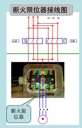 斷火限位器作為電動(dòng)葫蘆后一道電氣防線,平常不要使其頻繁動(dòng)作,在其下級(jí)要再裝一個(gè)限位開(kāi)關(guān),二者距離要適當(dāng)。下面是斷火限位器接線圖: