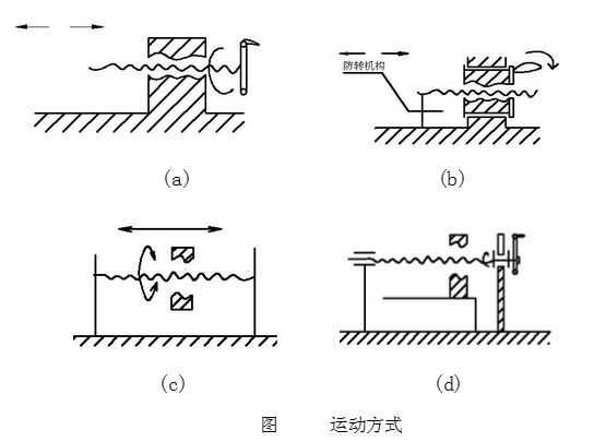四、螺桿轉(zhuǎn)動,如圖(d)螺母做直線運動,這種運動方式占據(jù)空間尺寸小,適用于長行程螺桿。螺桿兩端的軸承和螺母防轉(zhuǎn)機構(gòu)使其結(jié)構(gòu)較復(fù)雜。車床絲杠、刀架移動機構(gòu)多采用這種運動方式。